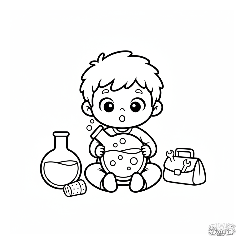 Página para colorir simples para crianças pequenas 2-3: um menino com um frasco grande de poção borbulhante em um laboratório secreto.