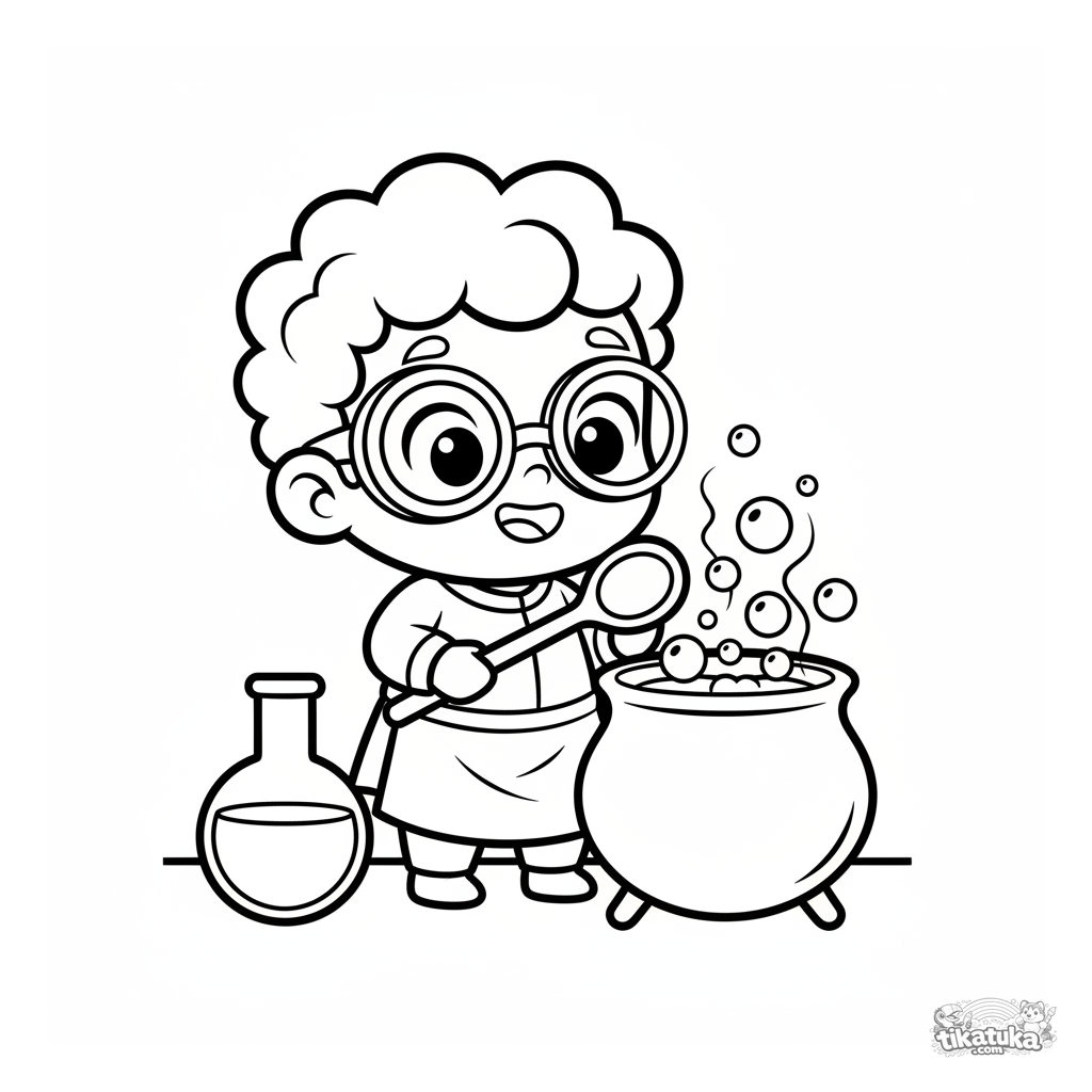 Página simples para colorir para crianças de 2-3 anos: um menino com óculos perto de um caldeirão borbulhante. Formas grandes, margens amplas.