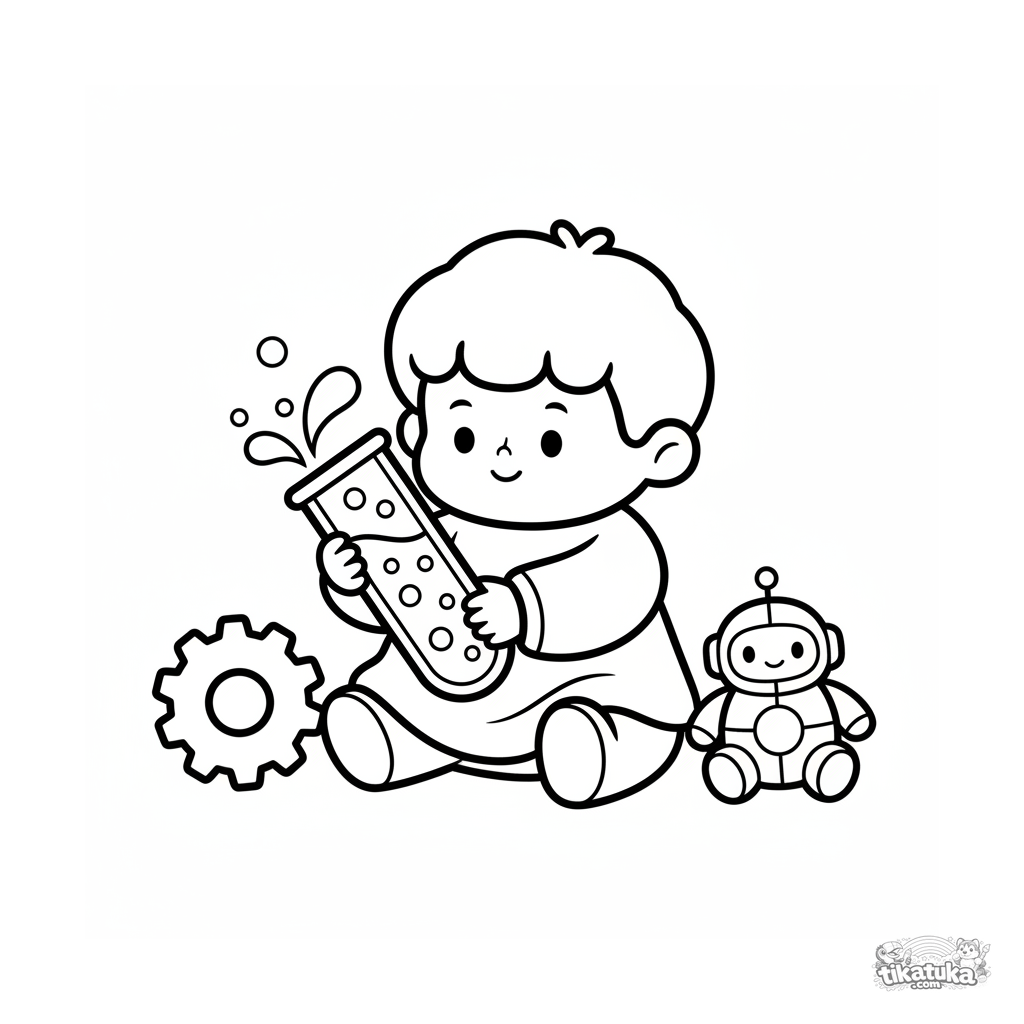 Página para colorir simples para crianças de 2-3 anos: um menino em um laboratório secreto observa um tubo de poção borbulhante. Formas grandes e margens amplas.