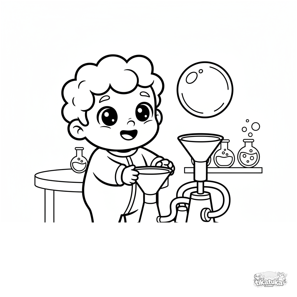 Página simples para colorir para crianças pequenas 2-3: um menino encantado com uma máquina de bolhas gigante em um laboratório secreto.