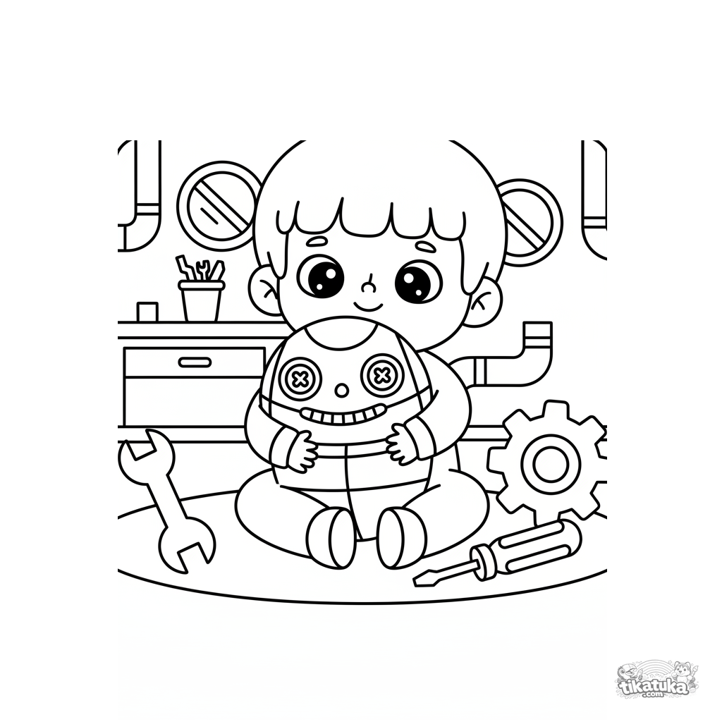 Página para colorir muito simples para crianças de 2-3 anos: um menino abraça um robô de pelúcia grande em um laboratório secreto. Grandes detalhes.