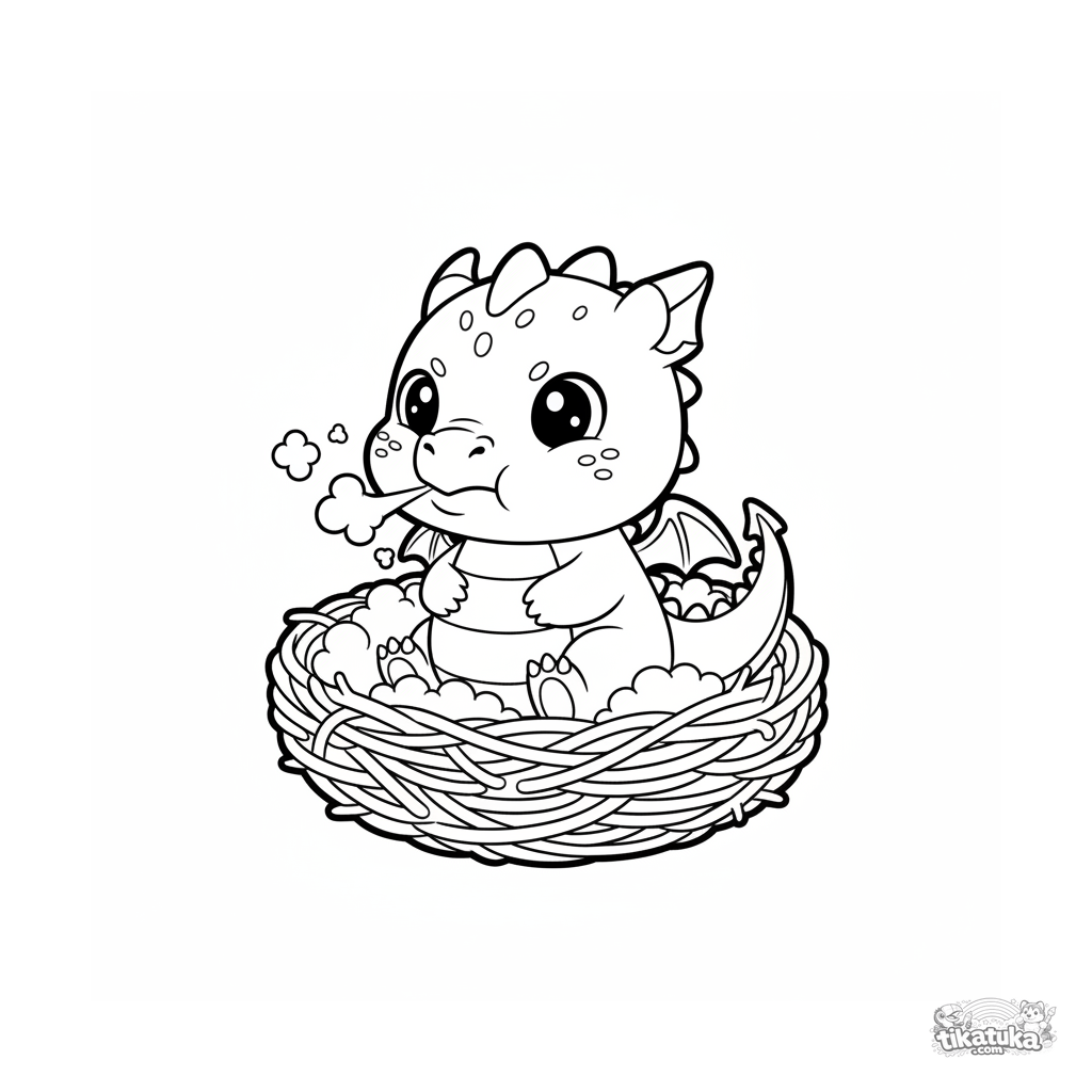Página simples para colorir para crianças pequenas 2-3: um bebê dragão em um ninho tenta soprar anéis de fumaça. Formas grandes e amigáveis.