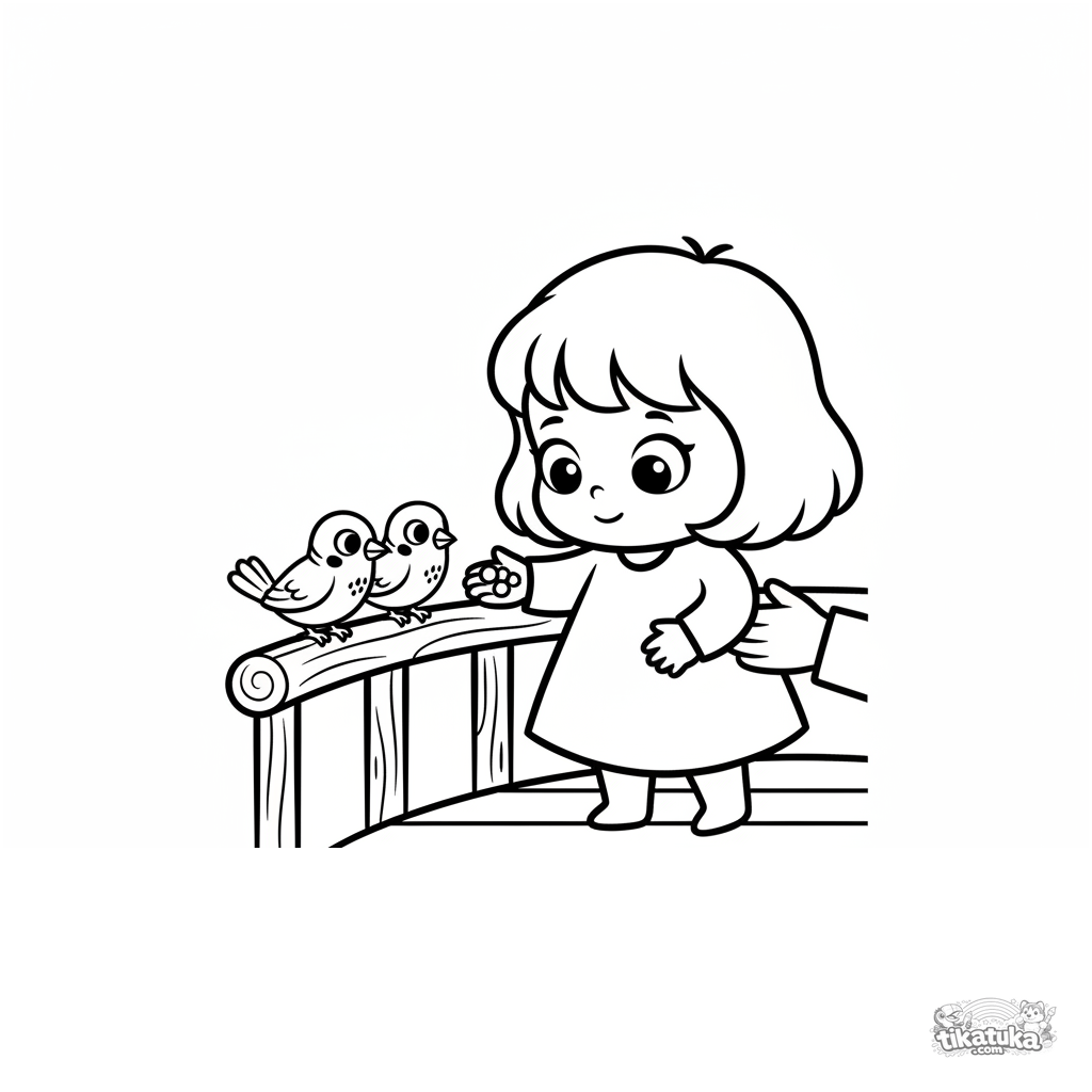 Página para colorir muito simples para bebês de 2-3 anos: uma criança alimenta pássaros do corrimão da varanda. Figuras grandes, detalhes mínimos, margens amplas.