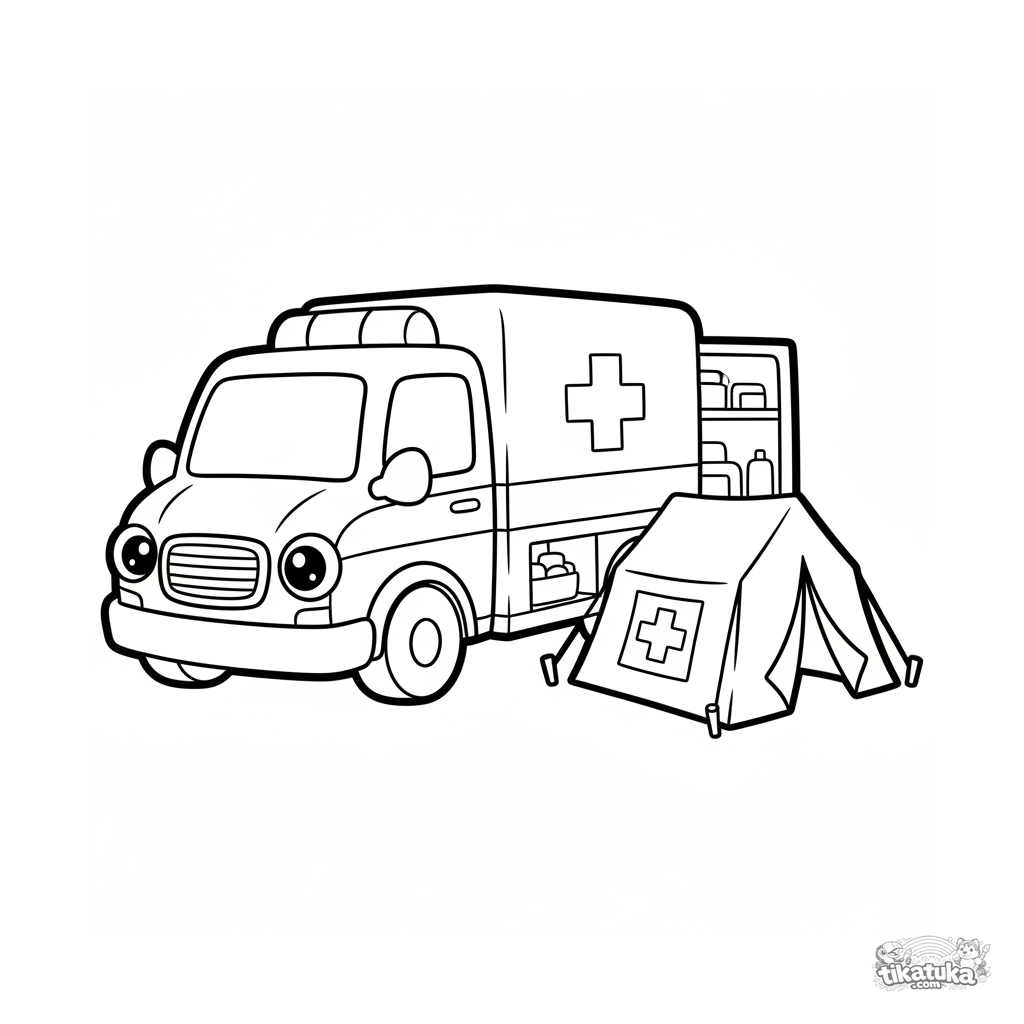 Página para colorir muito simples para crianças pequenas 2-3: um caminhão de ambulância amigável com uma cruz vermelha perto de uma barraca de hospital de campo.