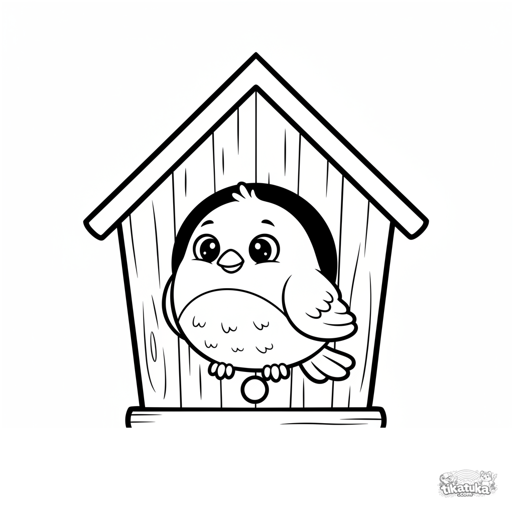 Página para colorir muito simples para crianças pequenas 2-3: um pássaro redondo sentado em uma casa de pássaros. Margens brancas enormes, contornos grossos, áreas grandes para colorir.