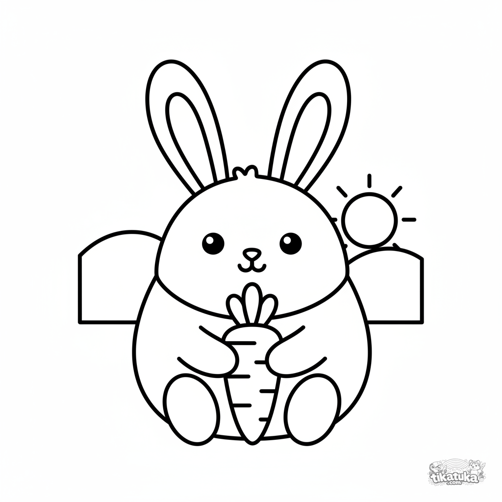 Página para colorir para crianças de 2-3 anos: um grande coelho redondo segura uma cenoura. Formas grandes e simples, contornos grossos, perfeito para primeiras experiências com pintura. Página para pintar por números para crianças.