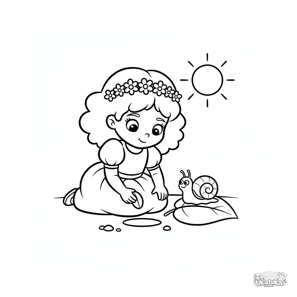 Página para colorir simples para bebês 2-3 anos: uma princesinha plantando uma semente no jardim. Formas grandes, margens amplas.