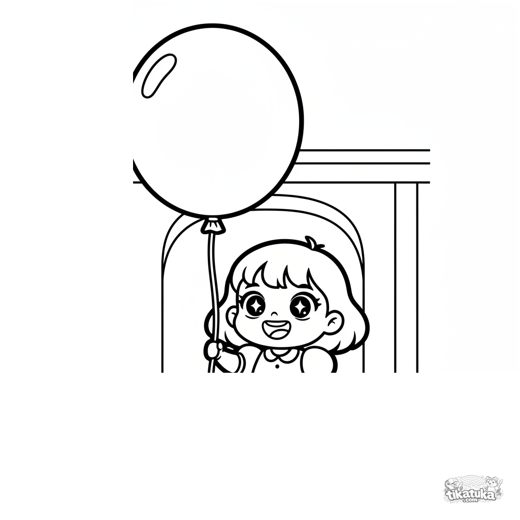 Página para colorir simples para bebês 2-3: uma menininha com um balão gigante em um salão festivo. Formas grandes e claras, poucos detalhes.