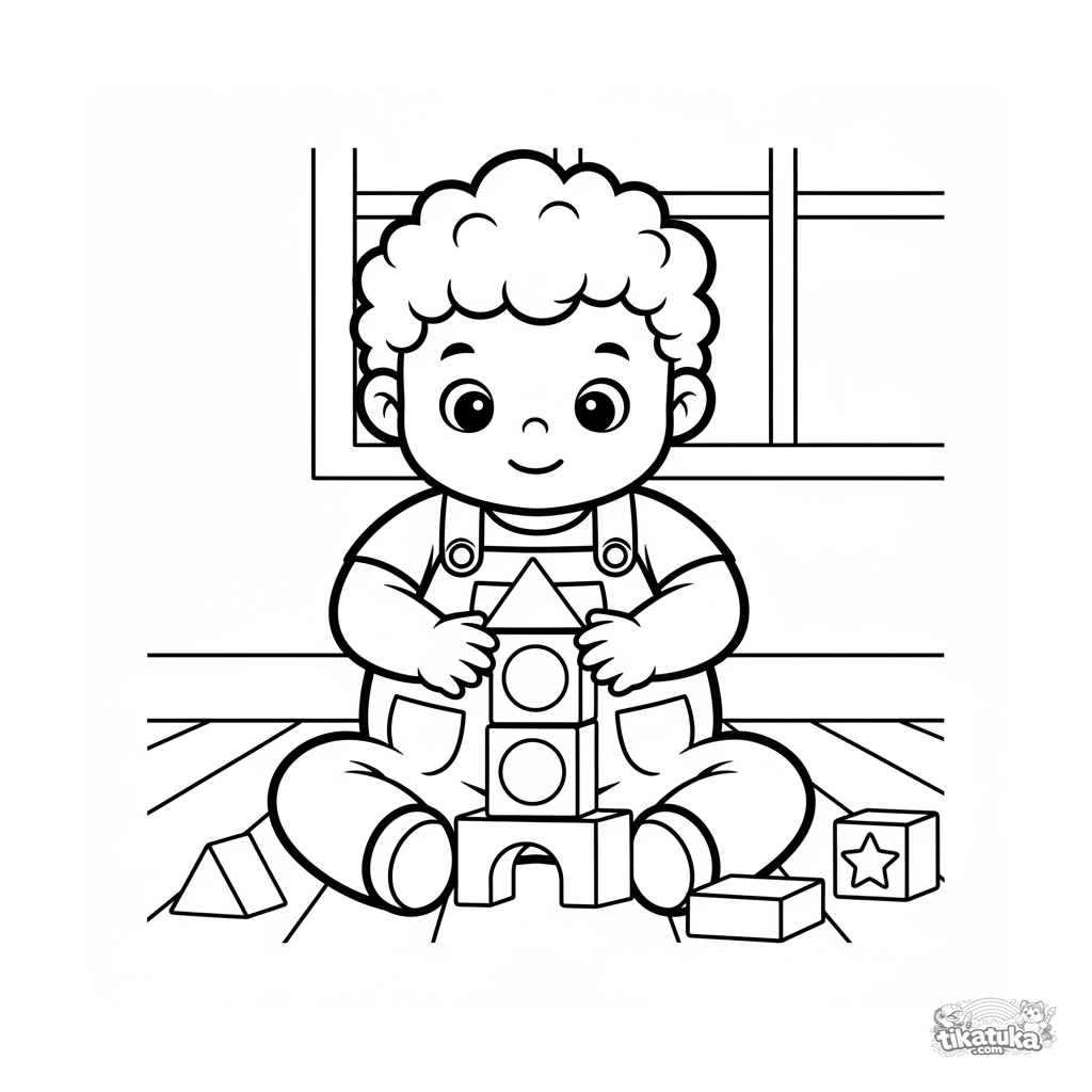 Página para colorir muito simples para crianças pequenas 2-3: uma criança construindo uma torre de blocos na sala de aula. Formas grandes e claras.