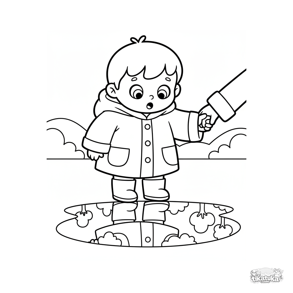 Página para colorir para crianças (2-3 anos): uma criança com capa de chuva segura a mão de um pai e olha admirada para o reflexo do céu em uma poça de outono. Formas muito simples.
