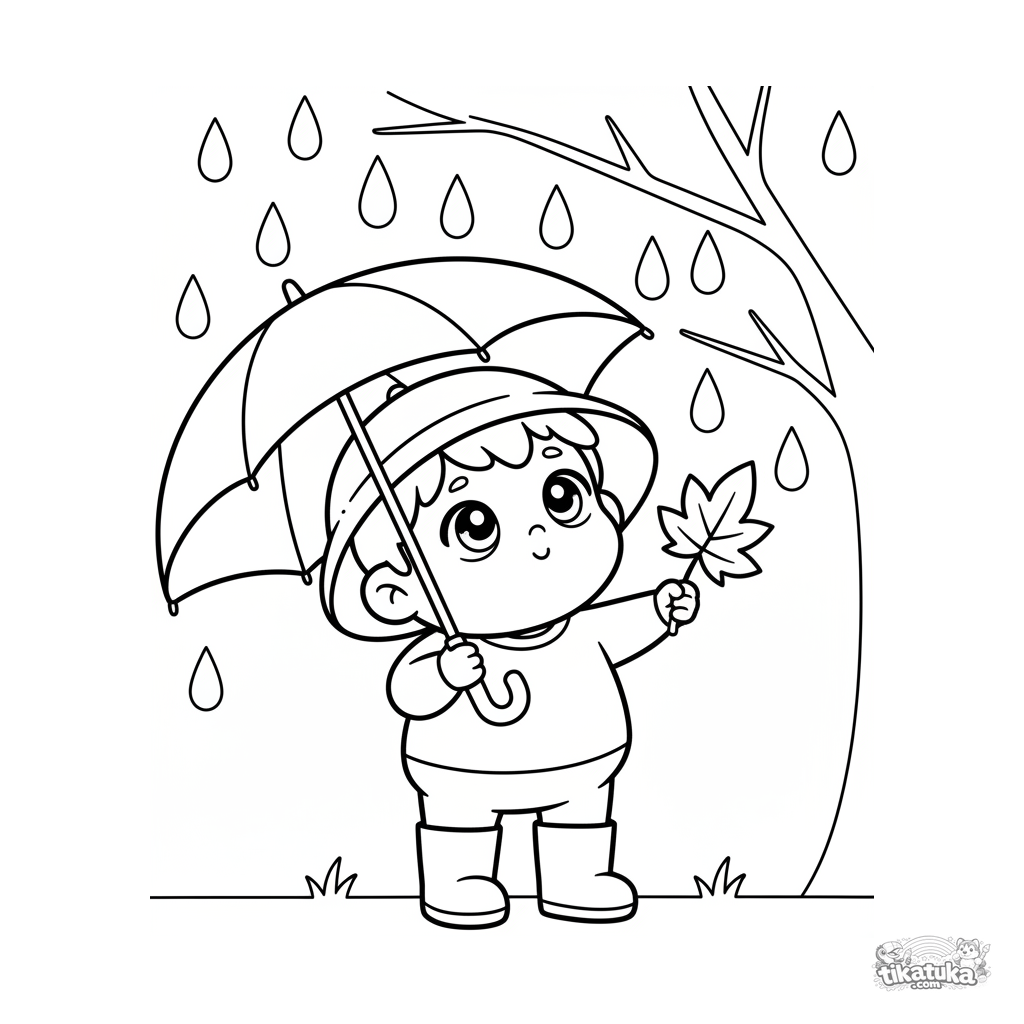 Página simples para colorir para bebês 2-3: uma criança com botas e guarda-chuva observa pingos caindo de uma árvore na chuva de outono.