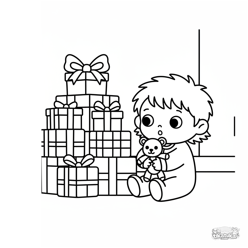 Página para colorir muito simples para crianças pequenas 2-3: uma menina de pijama sentada ao lado de presentes em um salão festivo. Formas grandes.