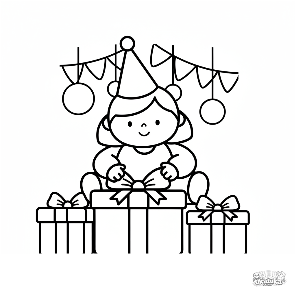 Página para colorir muito simples para crianças pequenas 2-3: uma criança com chapéu de festa sentada entre caixas de presente grandes.