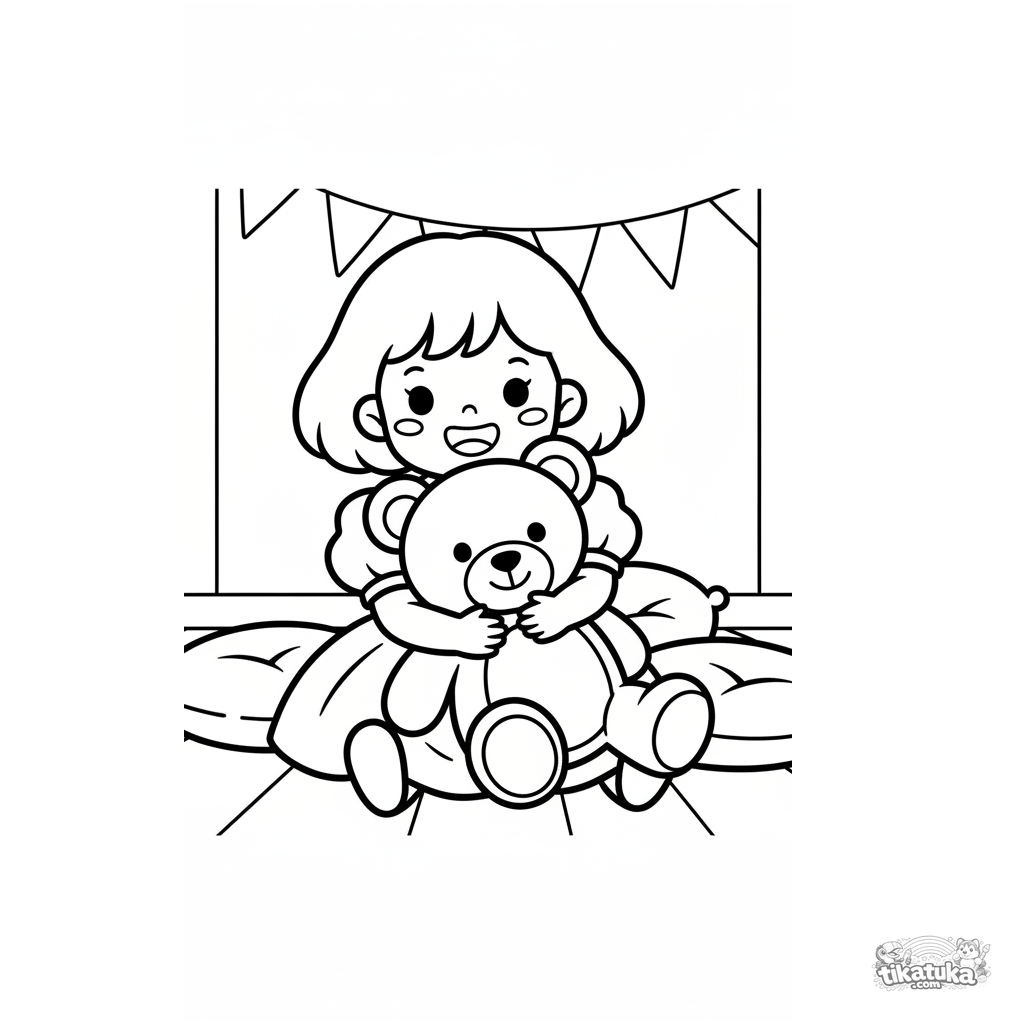 Página para colorir simples para 2-3 anos: uma menina em um salão festivo abraçando um urso de pelúcia. Formas grandes, contornos claros, margens amplias.