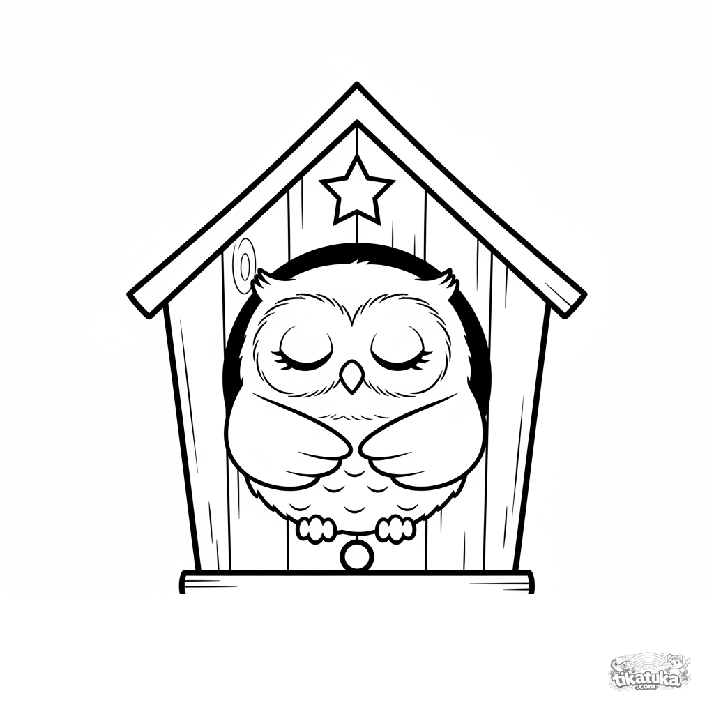 Página para colorir simples para crianças pequenas 2-3: uma corujinha fofa dormindo profundamente em uma casa de pássaros. Formas grandes e claras, margens amplas.