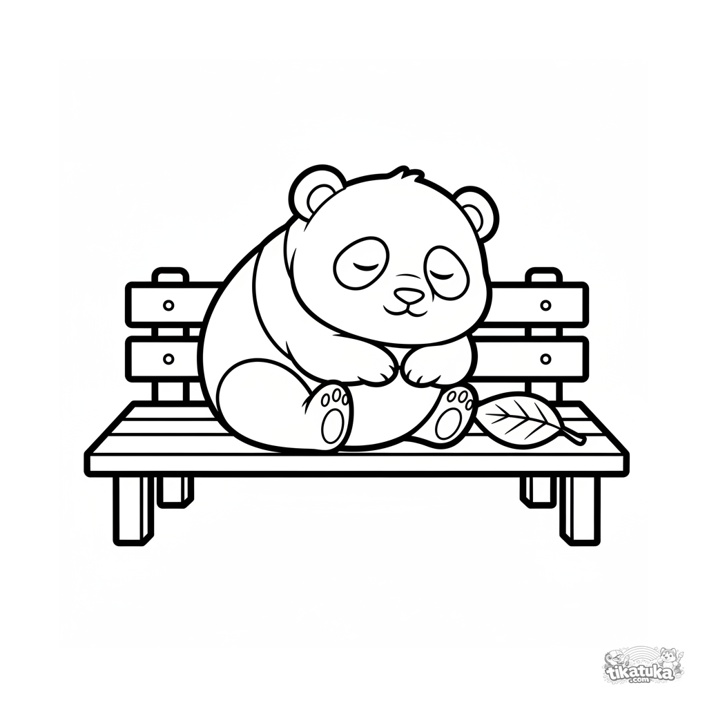 Página simples para colorir para bebês 2-3: um panda dormindo num banco de parque. Formas grandes e claras e margens amplas são perfeitas.
