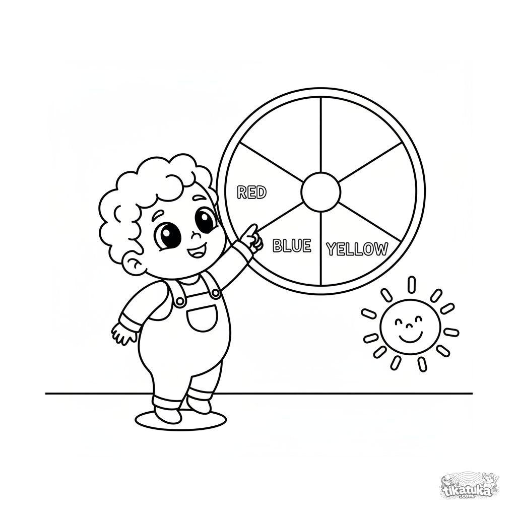 Página para colorir muito simples para bebês de 2-3 anos: uma criança em uma grande roda de cores na parede da área de bebês do zoológico. Formas grandes e claras.