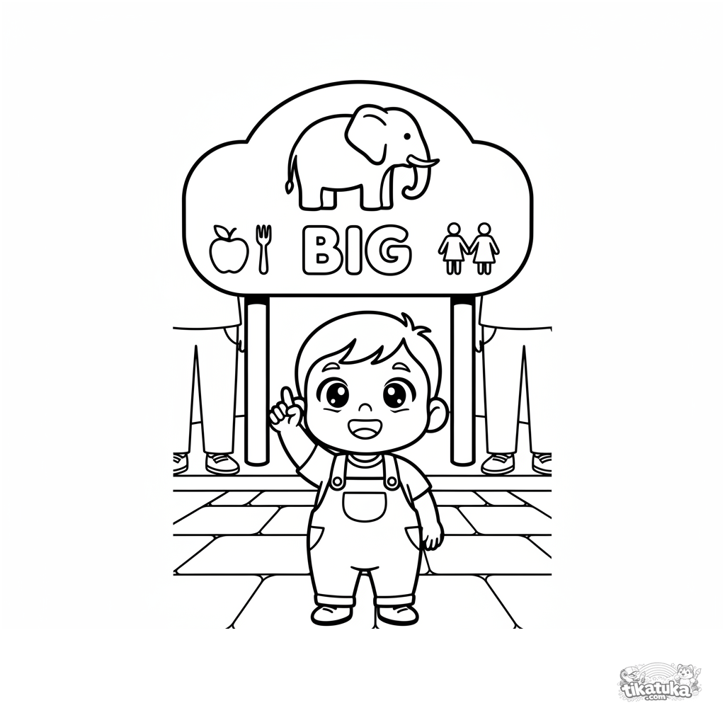 Página para colorir simples para crianças 2-3: uma criança aponta para uma placa grande com um elefante e a palavra 'GRANDE' no zoológico. Formas grandes, margens amplas.