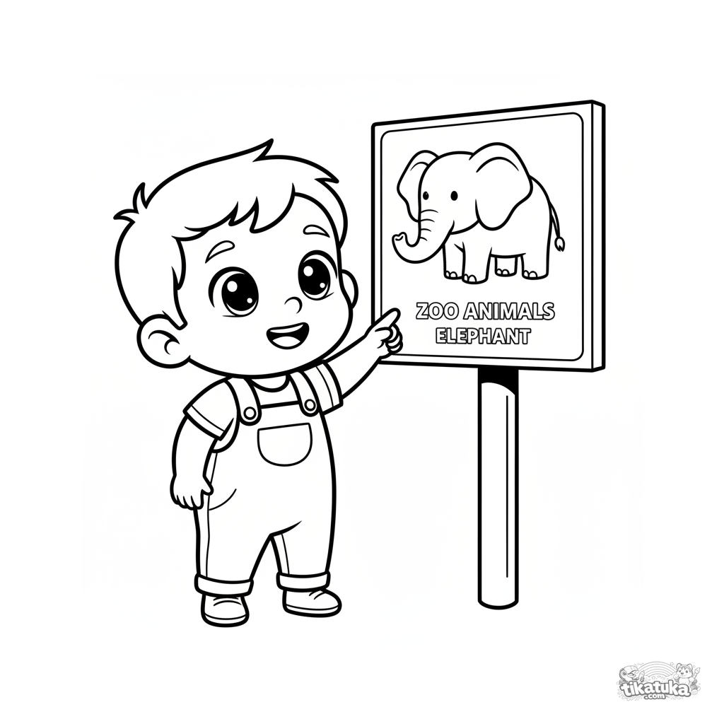Página para colorir simples para crianças 2-3: uma criança aponta para uma imagem grande de elefante em uma placa do zoológico. Formas grandes, detalhes mínimos.