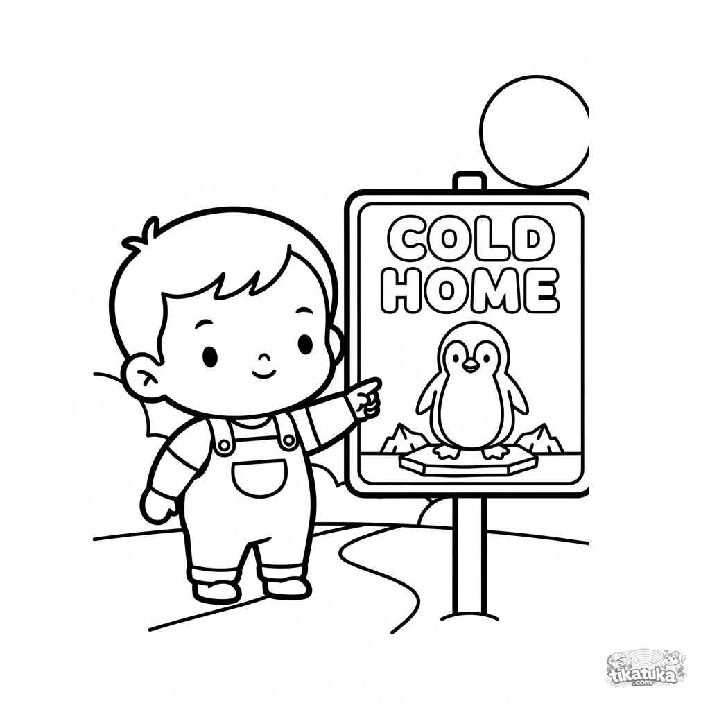 Página para colorir simples para bebês de 2-3 anos: uma criança aponta para um cartaz grande do habitat do pinguim. Margens muito largas.