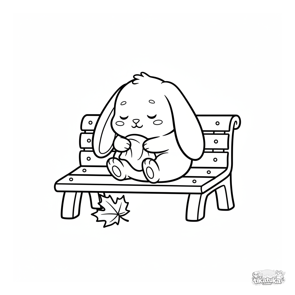 Página simples para colorir para bebês 2-3: um coelho fofo dormindo num banco de parque. Formas grandes.