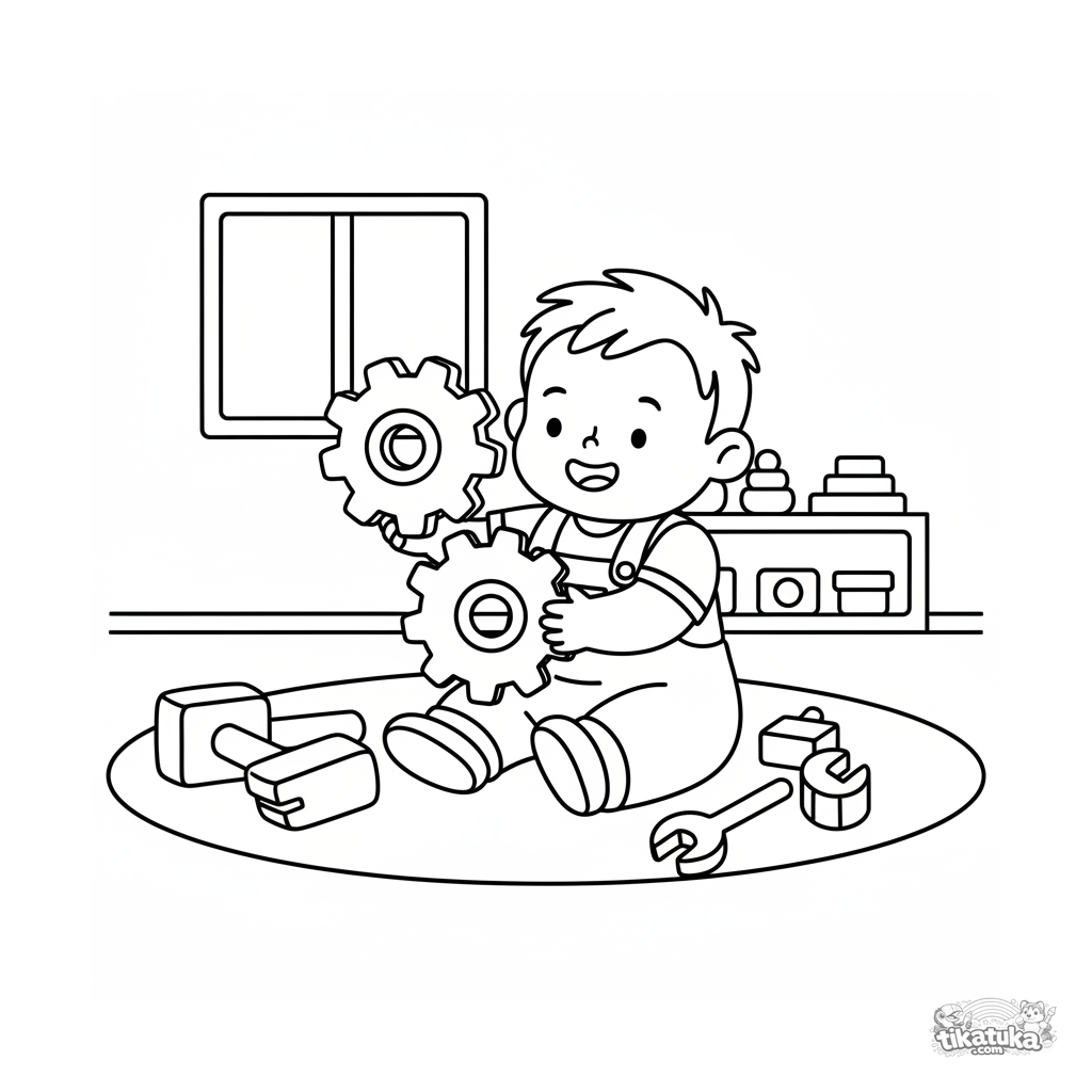 Página muito simples para colorir para crianças: uma criança empilha engrenagens gigantes na área de brincar.