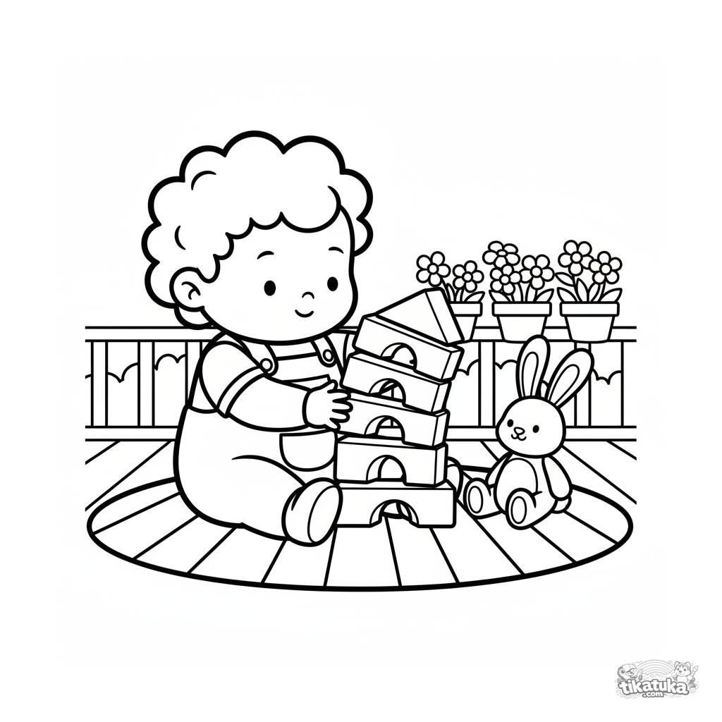 Página para colorir simples para bebês 2-3: uma criança empilhando blocos em um tapete de varanda. Formas grandes, poucos detalhes, margens amplas.