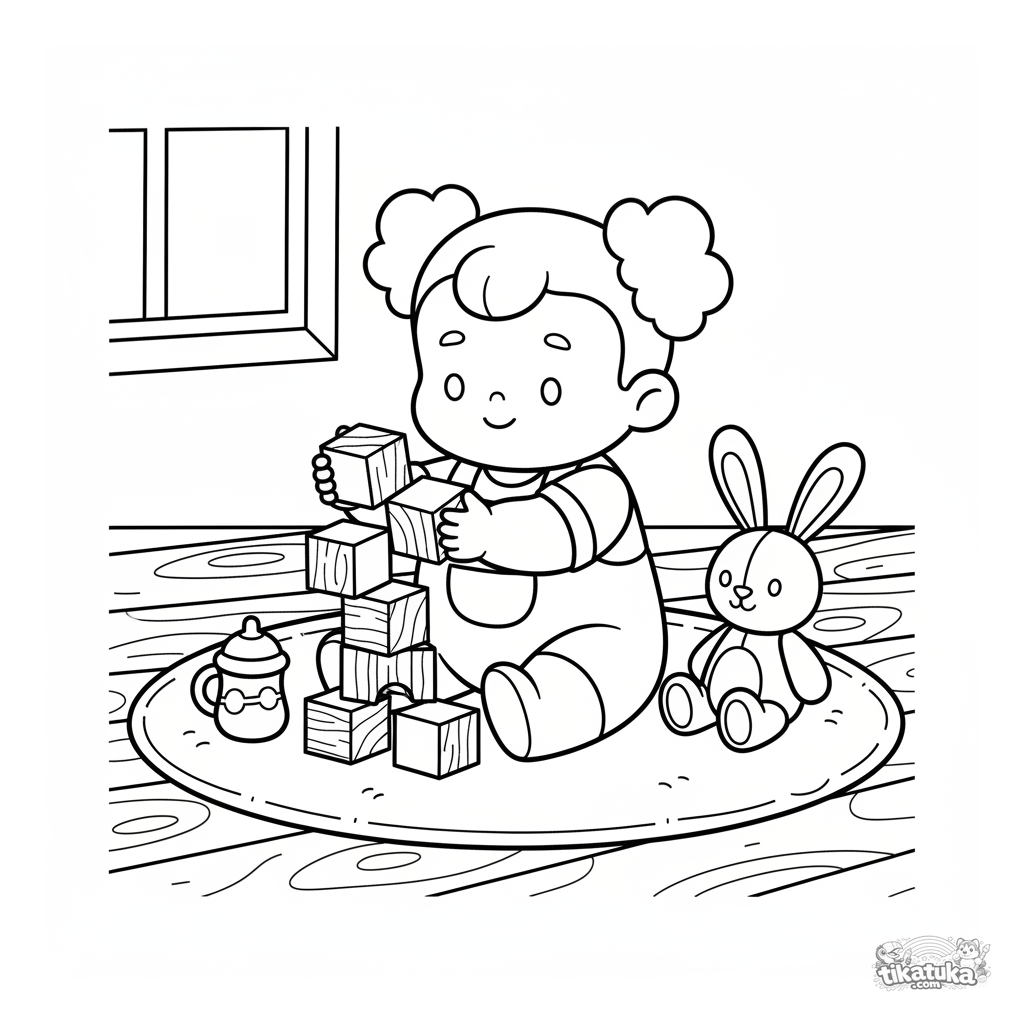 Página para colorir muito simples para crianças pequenas 2-3: uma criança construindo uma torre com blocos no chão da varanda. Formas grandes, contornos claros, perfeito para primeiras tentativas de colorir.