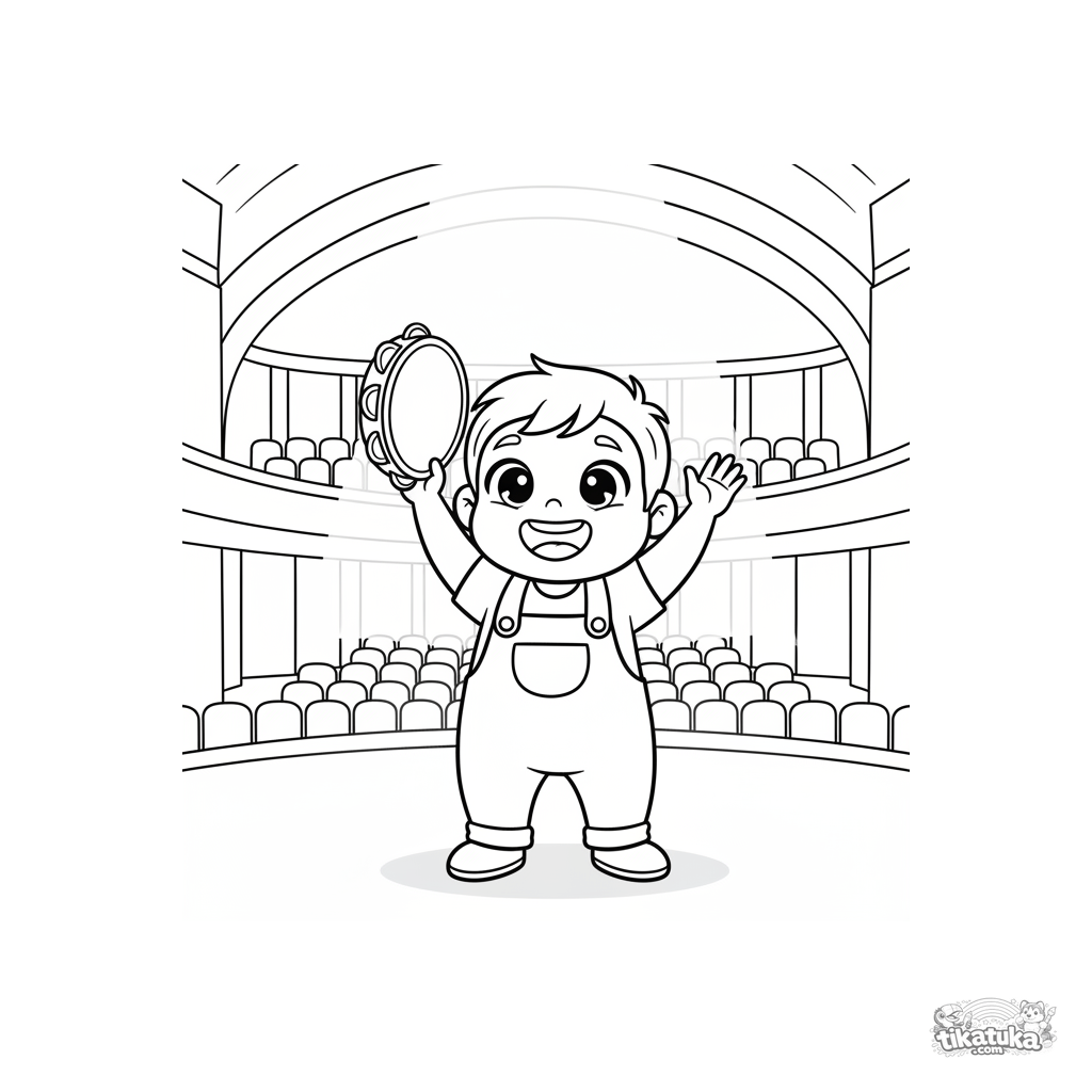 Página simples para colorir para crianças pequenas 2-3: uma criança alegre com um pandeiro no palco. Formas grandes e margens amplas.