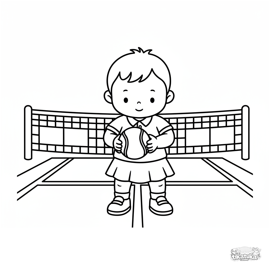 Página para colorir para crianças de 2-3 anos: uma criança alegre em uma quadra de tênis aprendendo a quicar uma bola grande. Formas simples e margens amplas.