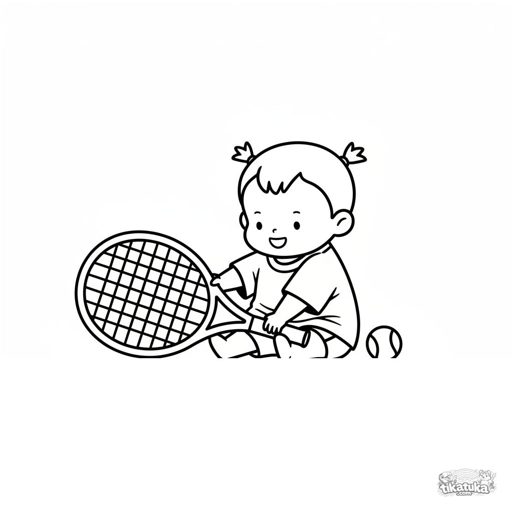 Página para colorir para crianças de 2-3 anos: uma criança engraçada em uma quadra de tênis explorando uma raquete grande. Formas simples enormes, detalhes mínimos, margens amplas.