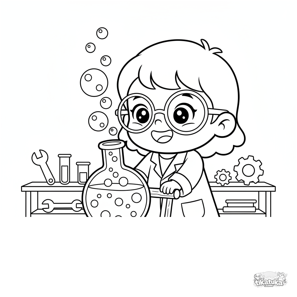 Página para colorir simples para crianças pequenas de 2-3 anos: uma criança feliz em jaleco de laboratório empurra um carrinho com um frasco borbulhante.