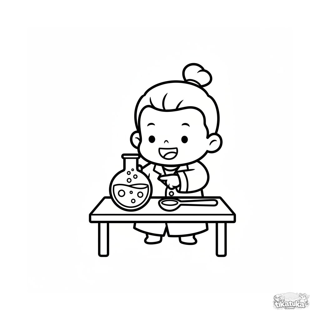 Página para colorir para bebês 2-3: um pequeno explorador em um laboratório observa uma poção borbulhante mágica com deleite. Formas muito simples e grandes para colorir.