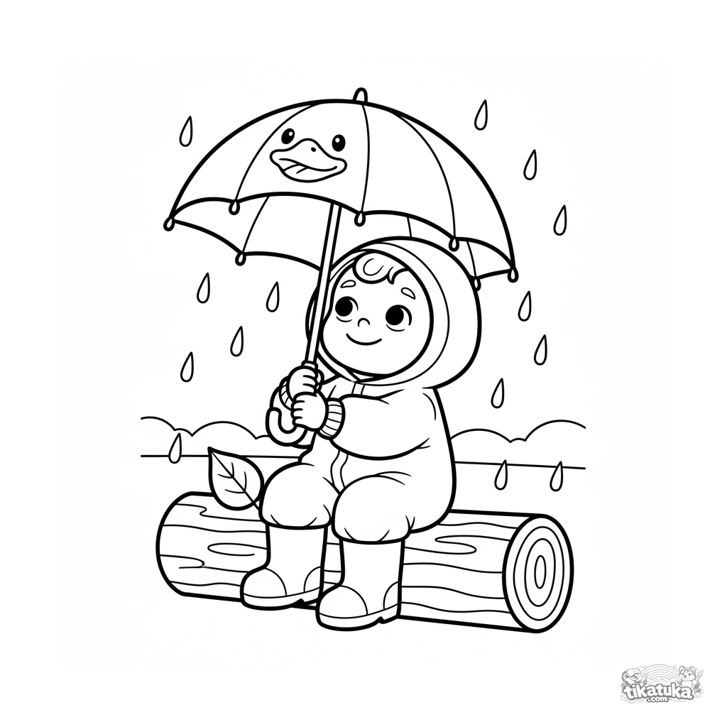 Página para colorir para crianças pequenas 2-3: desenho simples de uma criança pequena com botas sentada em um tronco com guarda-chuva de pato sob a chuva de outono.