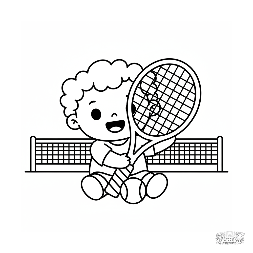 Página para colorir muito simples para crianças pequenas 2-3: uma criança sentada na quadra com uma raquete enorme. Formas grandes, uma bola grande.