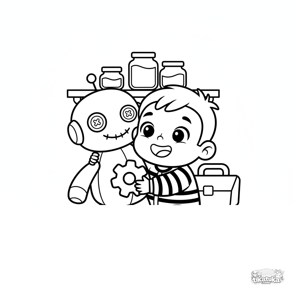 Página para colorir simples para crianças de 2-3 anos: um menino abraça um grande robô de pelúcia assistente no laboratório secreto de um inventor.