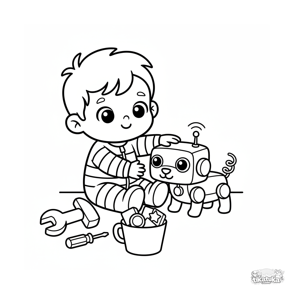 Página simples para colorir para crianças de 2-3 anos: uma criança e um cachorro robô em um laboratório secreto.