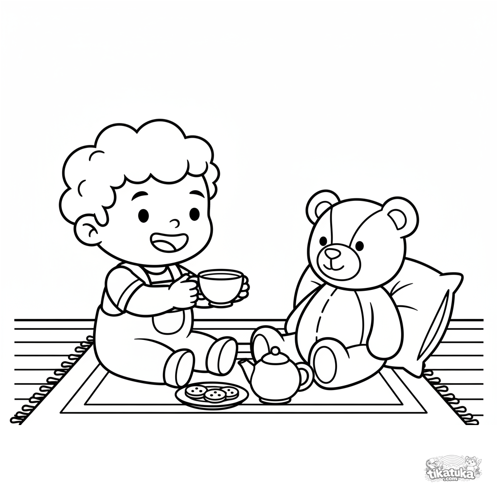 Página simples para colorir para bebês de 2-3 anos: uma criança em uma festa de chá de faz de conta com um urso de peluche no tapete da varanda. Figuras grandes.