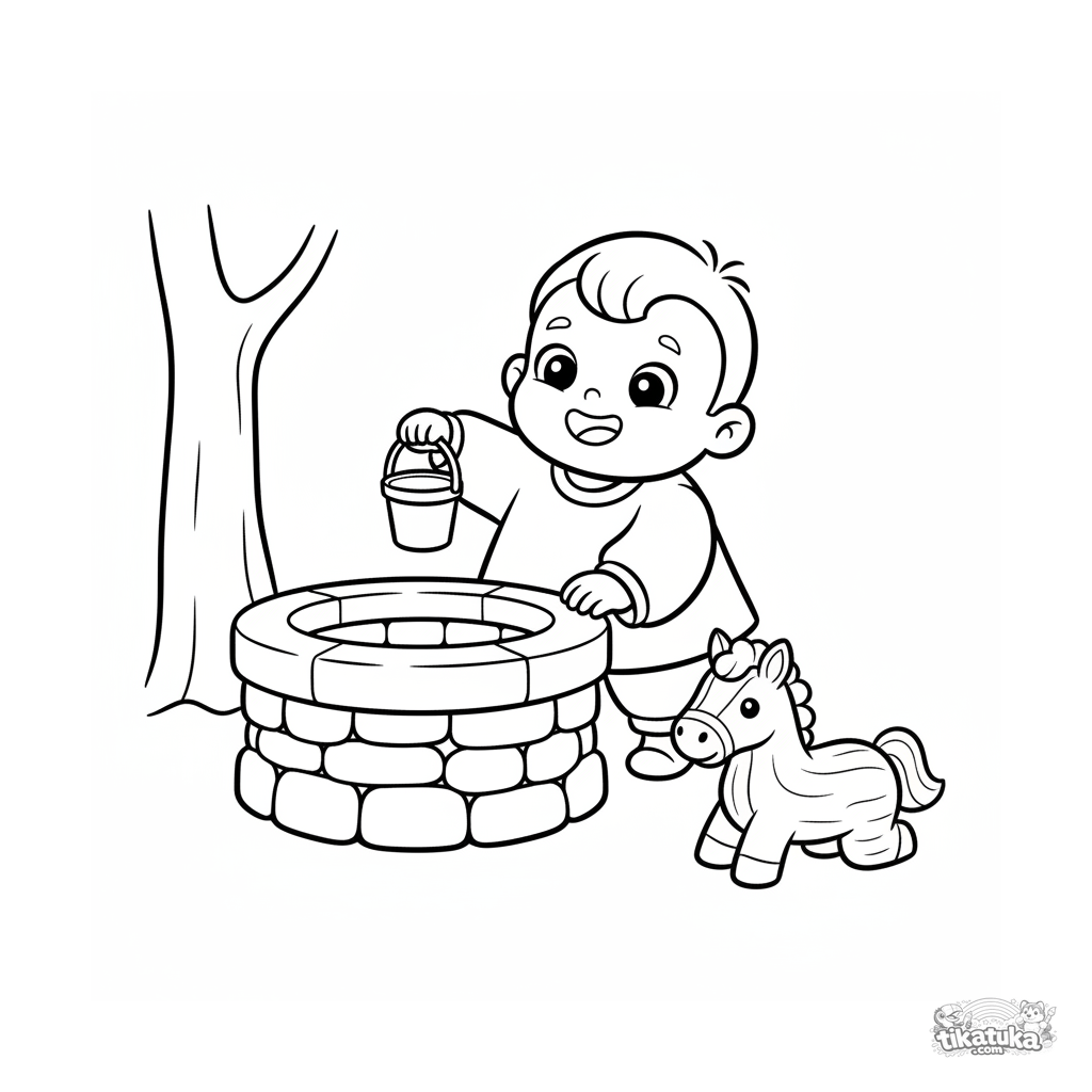 Página para colorir muito simples para bebês 2-3: uma criança com um balde de brinquedo no poço. Formas grandes, contornos grossos, muito espaço em branco.
