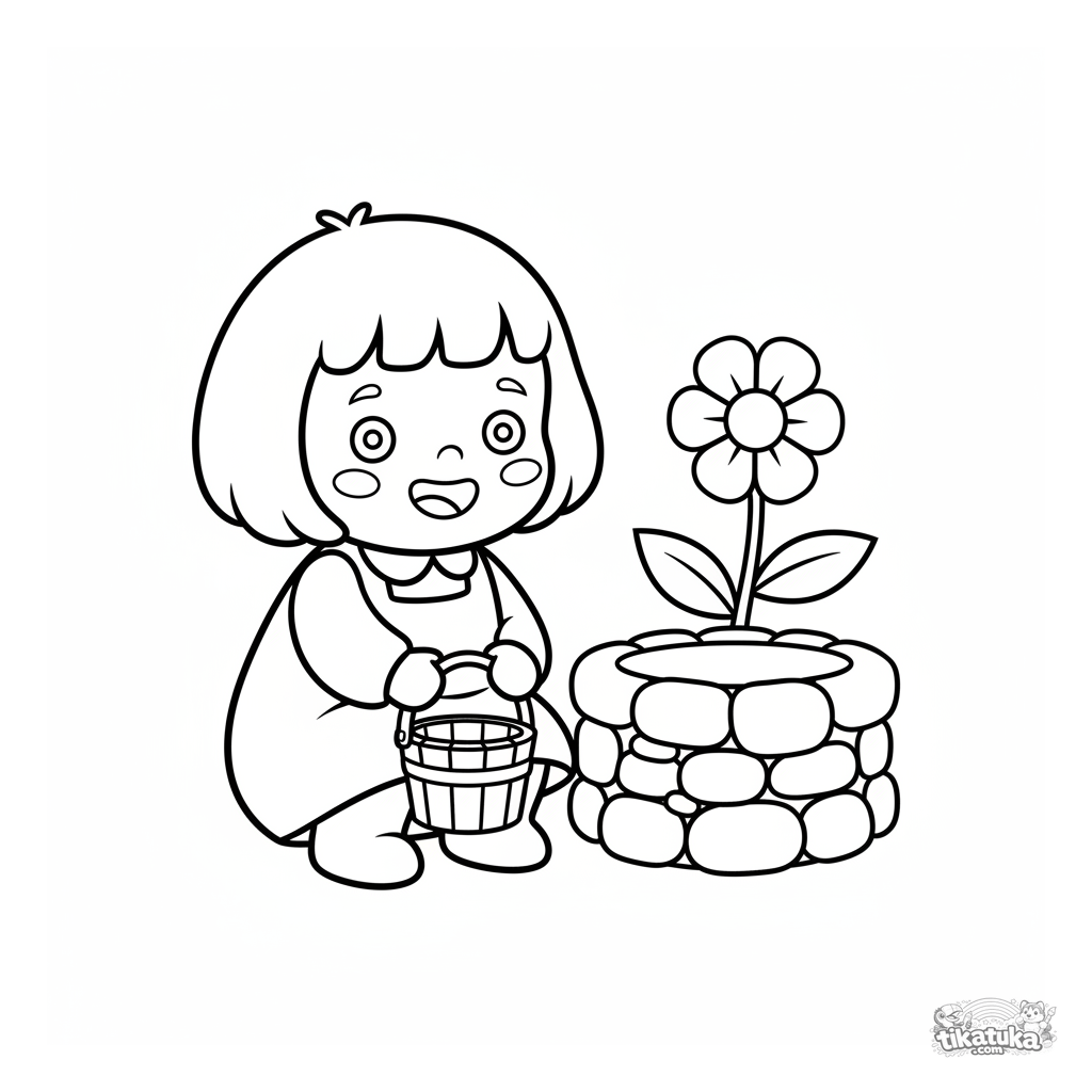 Página para colorir muito simples para bebês 2-3: uma criança com balde de brinquedo junto a um poço pequeno. Formas grandes e claras, muito espaço livre.
