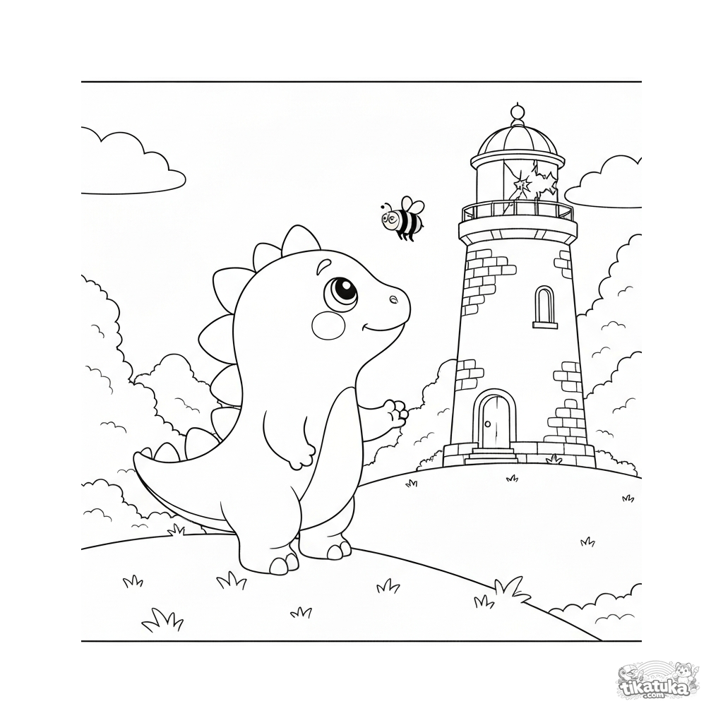 Tosha, o dinossauro explorador, está numa colina olhando um farol antigo, com uma abelha a voar para o seu nariz. Baixe, imprima ou pinte online!