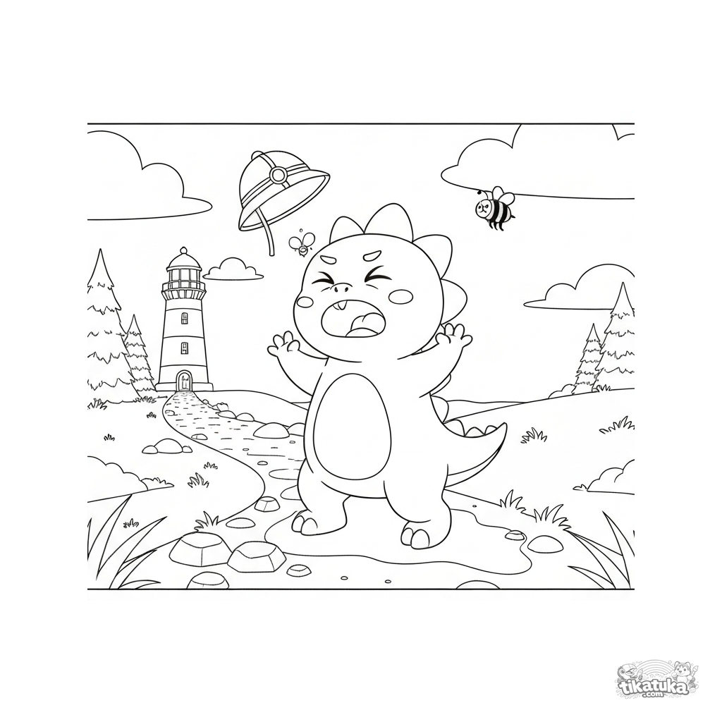 O Grande Espirro: dinossauro Tosha espirra perto de um farol, seu capacete voa. Baixe, imprima ou pinte online esta cena divertida!