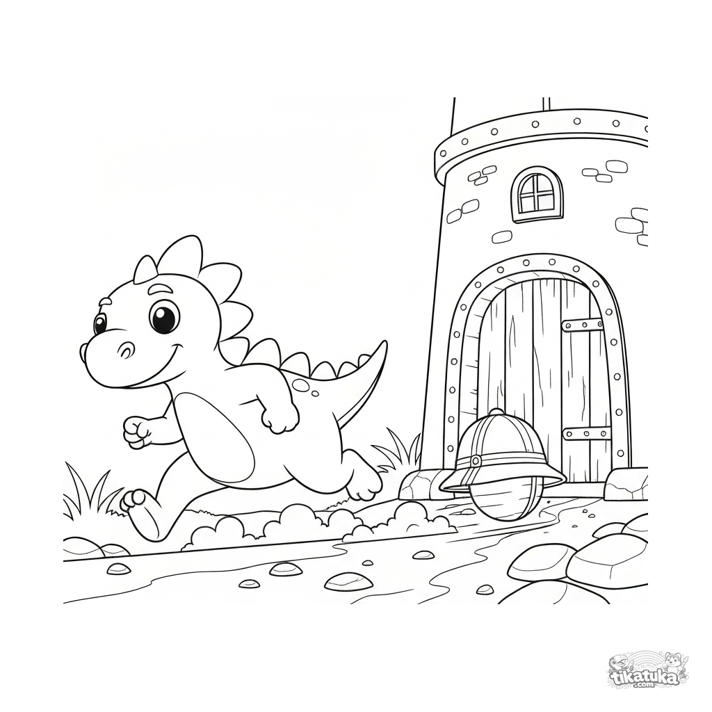 Tosha, o dinossauro, persegue seu chapéu perto de um farol. Baixe, imprima e pinte esta cena de aventura online!