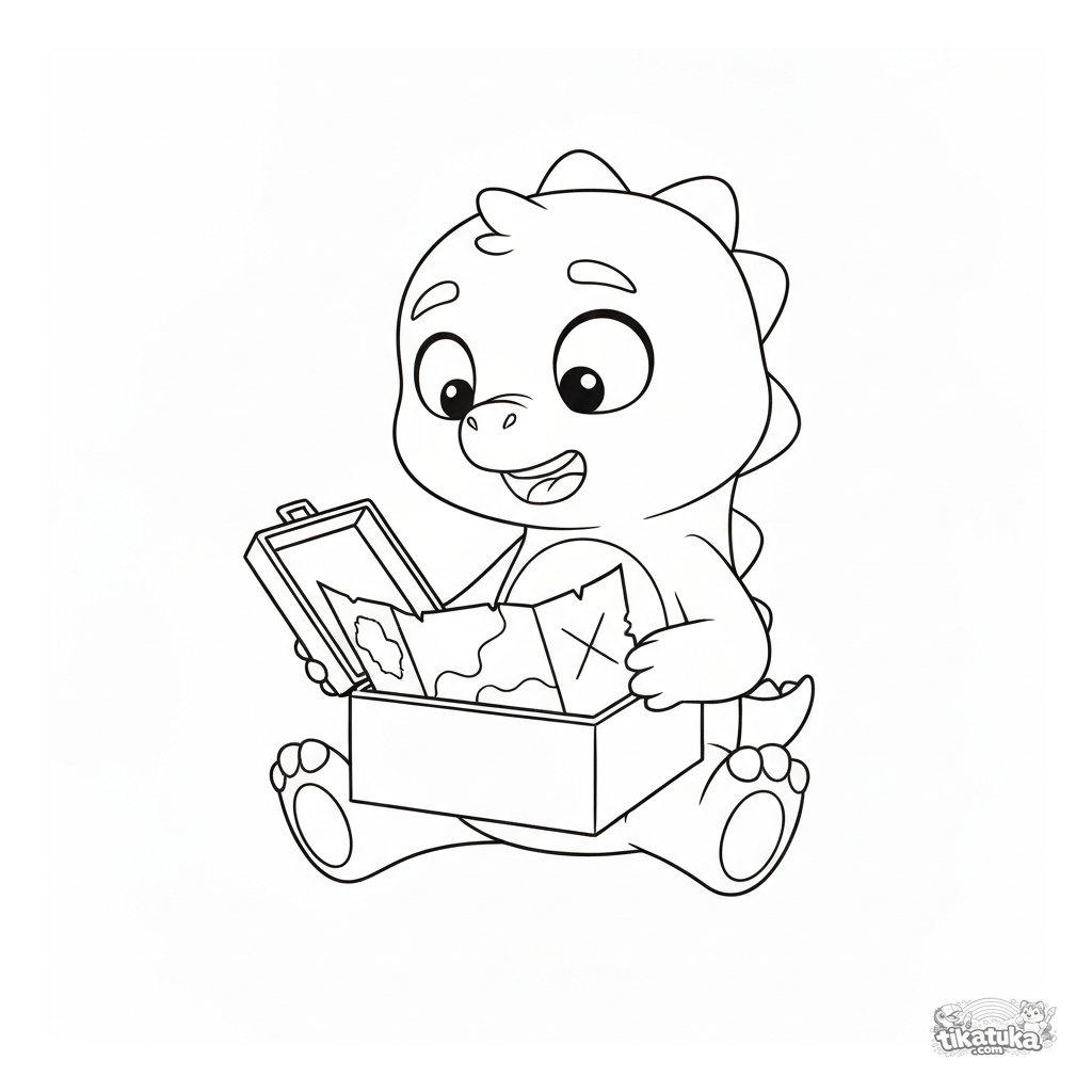 Tosha, o dinossauro, encontra um mapa do tesouro com um 'X' marcando o segredo. Baixe, imprima ou pinte online grátis!