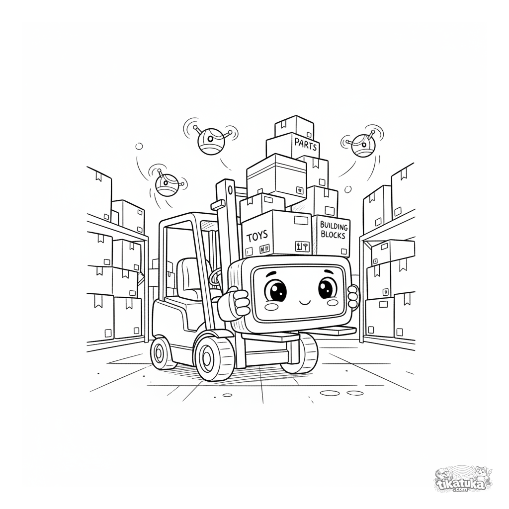 Página para colorir para crianças 4-6 anos: um robô empilhadeira empilhando caixas em um armazém movimentado, com drones voando. Contornos claros, formas simples.