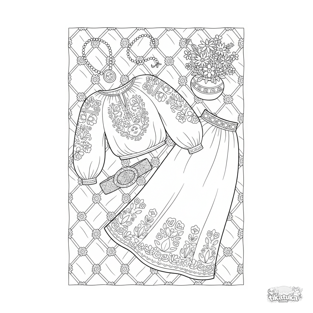 Página detalhada para colorir para meninas: uma blusa tradicional bordada e acessórios arrumados em um edredom em um quarto aconchegante. Padrões intrincados, texturas de tecido.