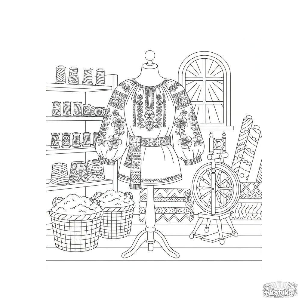 Página para colorir detalhada para 10-12 anos: uma blusa bordada tradicional em um manequim em uma oficina têxtil rural, com prateleiras de linhas, fios e rolos de tecido.
