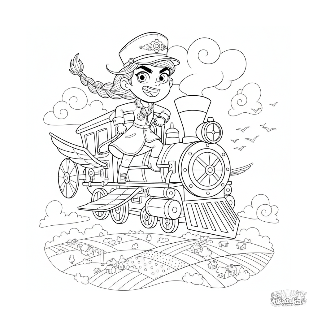 Página para colorir dinâmica estilo anime para 10-12 anos: uma corajosa condutora está no estribo de uma locomotiva a vapor voadora sobrevoando colinas e vilas.