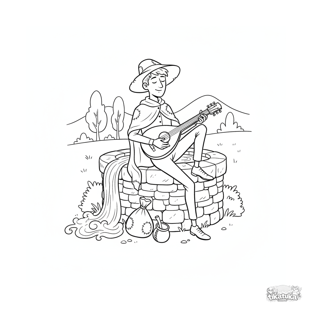 Página para colorir para crianças 7-9: um menestrel viajante cansado afina seu instrumento junto ao poço. Detalhes: manto, chapéu, sacola de viagem, cabaça para beber.