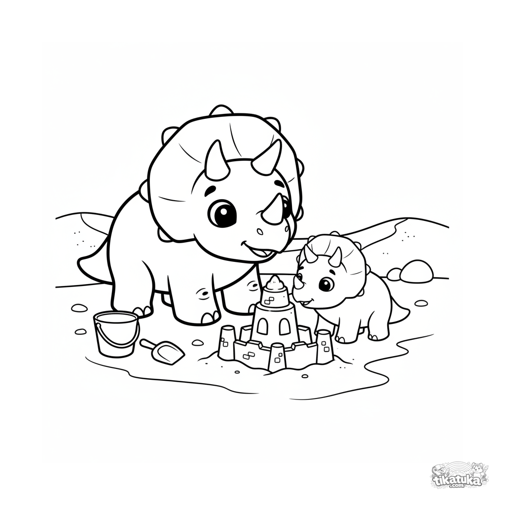 Página para colorir para crianças 4-6: um triceratops adulto e um filhote inspecionando um castelo de areia numa praia oceânica antiga. Estilo de boneco de pano.